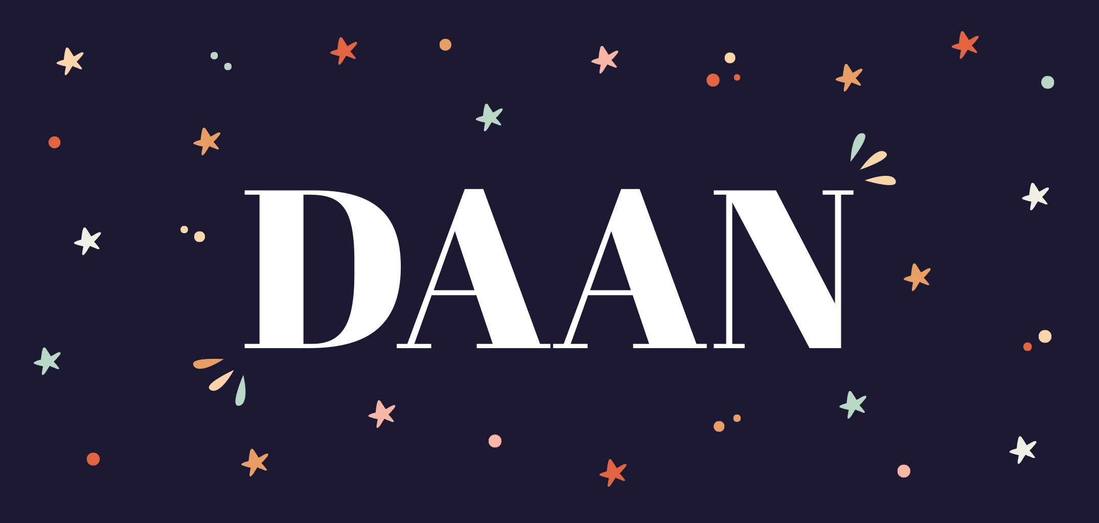 Stoer en uniek geboortekaartje met een donkerblauwe achtergrond en kleurrijke sterretjes.