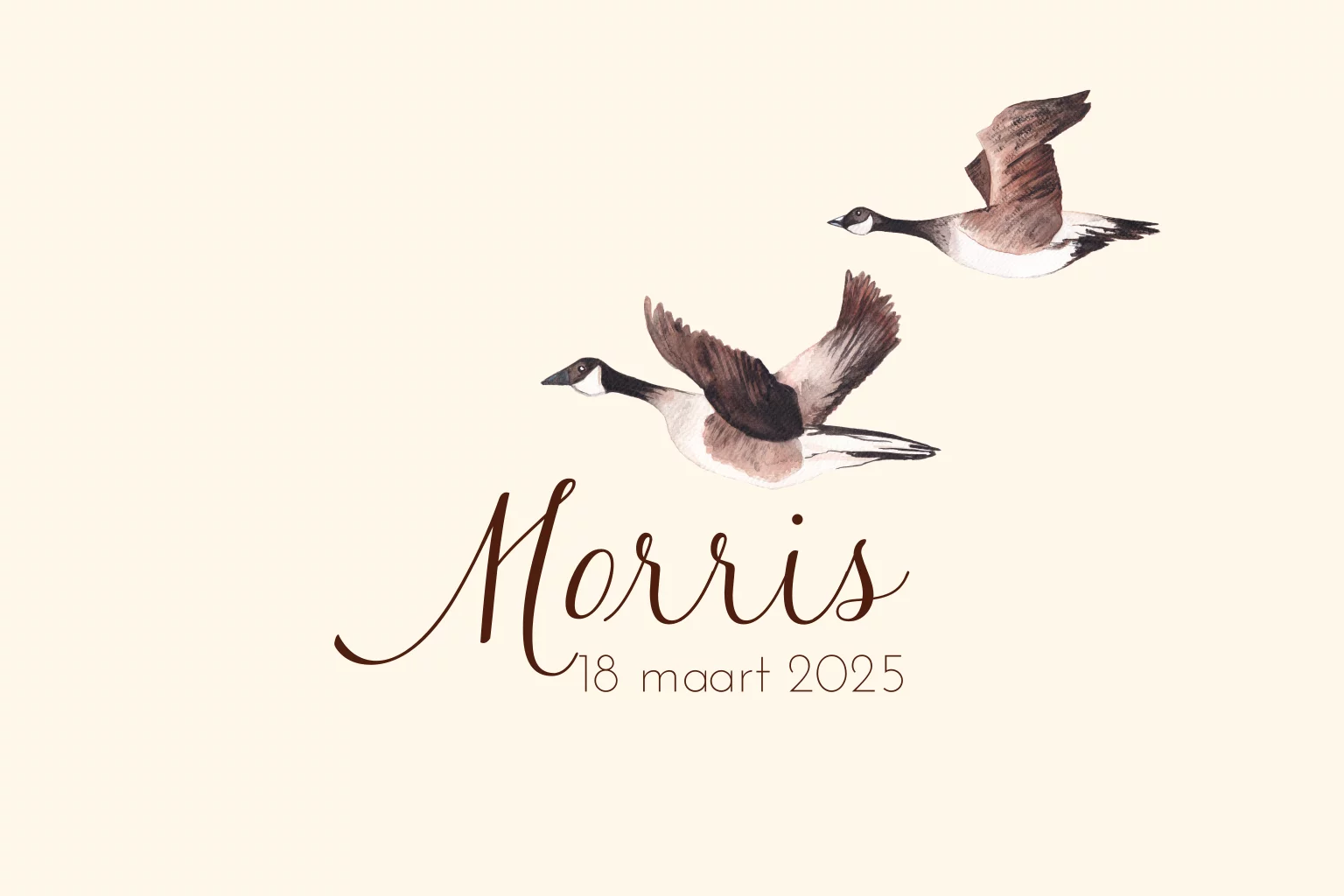 Klassiek geboortekaartje met twee vliegende ganzen.