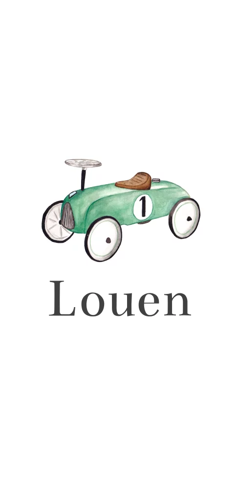 Subtiel geboortekaartje met een loopauto in het groen. Het element is geschilderd in aquarel.
