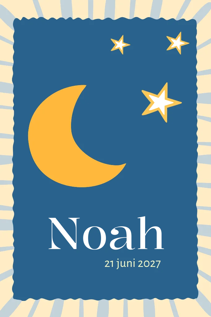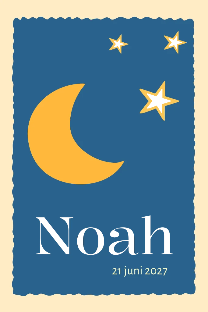 Een mooi geboortekaartje voor een jongen met een donkerblauwe achtergrond met een grote maan en kleine sterren in goudfolie.