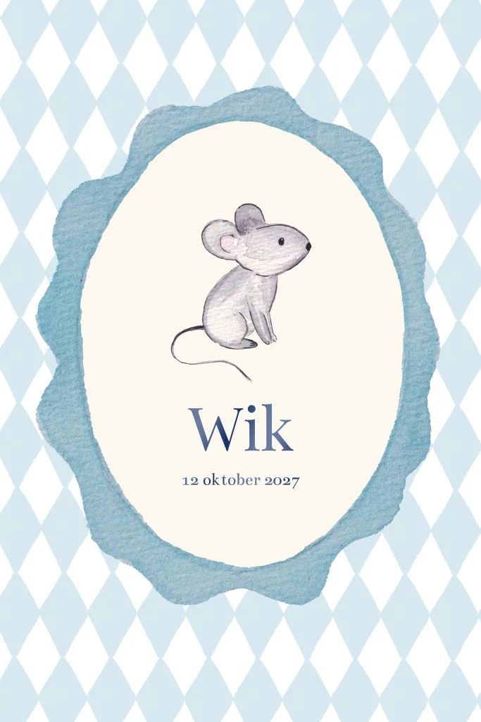 Het geboortekaartje is uitgevoerd in blauw met een ruitjesachtergrond. De illustratie van het muisje is zichtbaar in zachte grijstinten, wat goed aansluit bij de kleuren van het kaartje.
