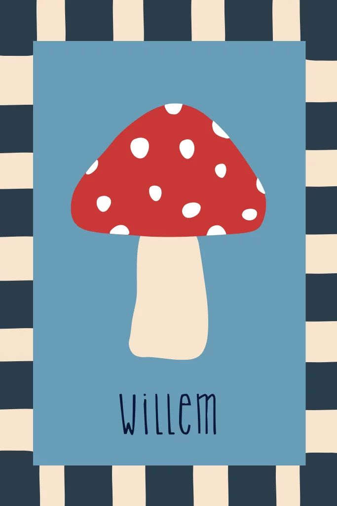 Vrolijk geboortekaartje met een paddenstoel en streepjesrand in blauw