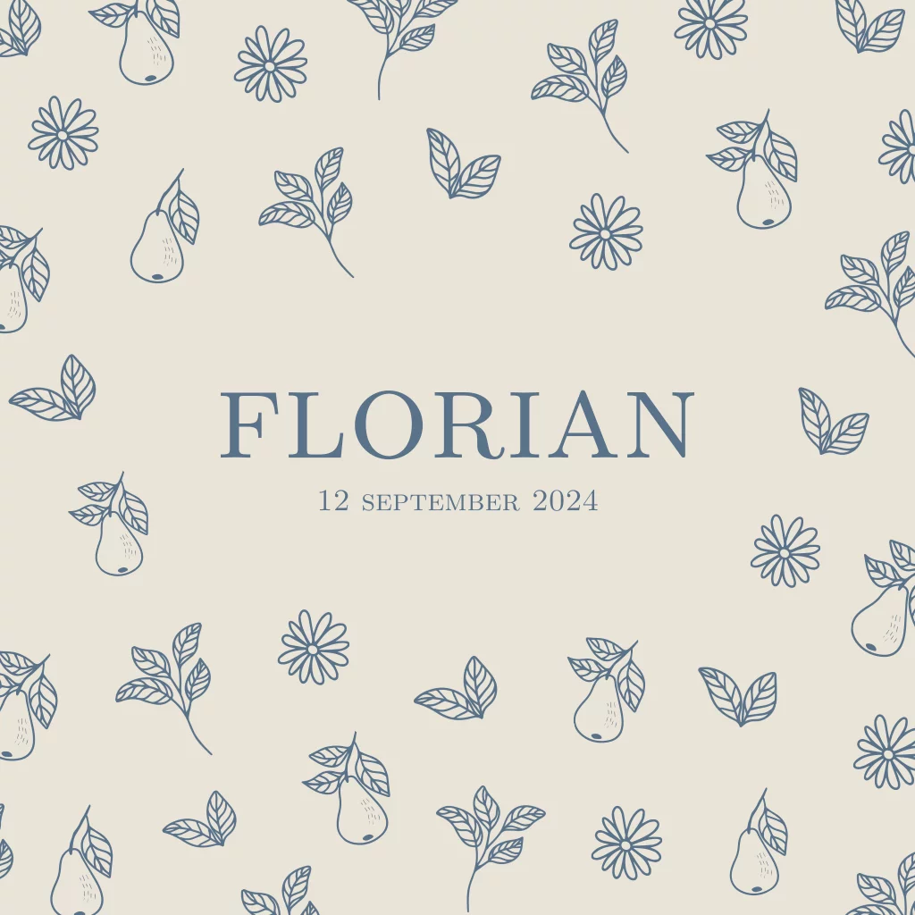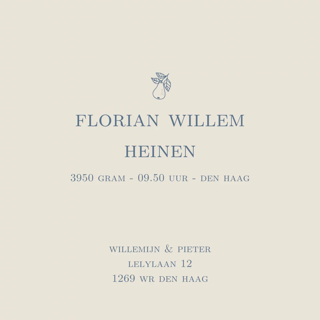 Prachtig uniek geboortekaartje met een patroon van peertjes, takjes en bloemen. De mooie ijsblauwe kleur maakt het kaartje mooi uniseks.