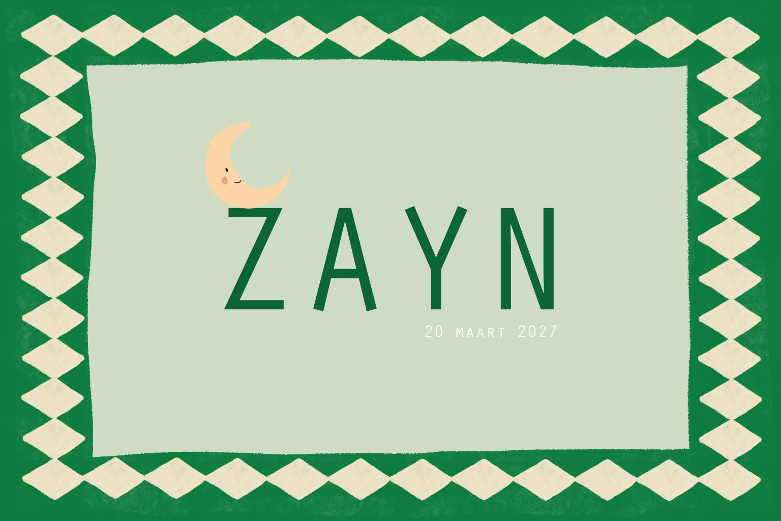 Dit geboortekaartje is uitgevoerd in groen met lichte accenten. De ruitjesrand vormt een grafisch kader rondom het kaartje. De maan en de typografie sluiten aan bij het kleurgebruik en zorgen voor een evenwichtig geheel.