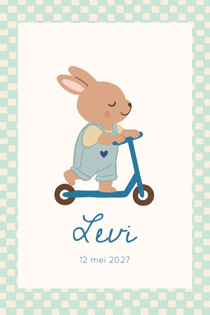 Een stoer geboortekaartje met een illustratie van een konijntje op een step. Het diertje staat centraal op de voorkant en zorgt voor een speels en vriendelijk ontwerp.