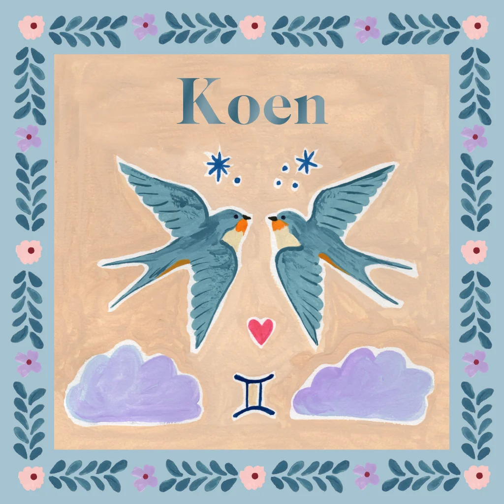 Een mooi geboortekaartje voor een jongen met het sterrenbeeld Tweelingen. Op de voorkant staan twee vogels die elkaar aankijken, aangevuld met sterren, wolken en het symbool van Tweelingen. Dit kaartje verwijst duidelijk naar het sterrenbeeld.