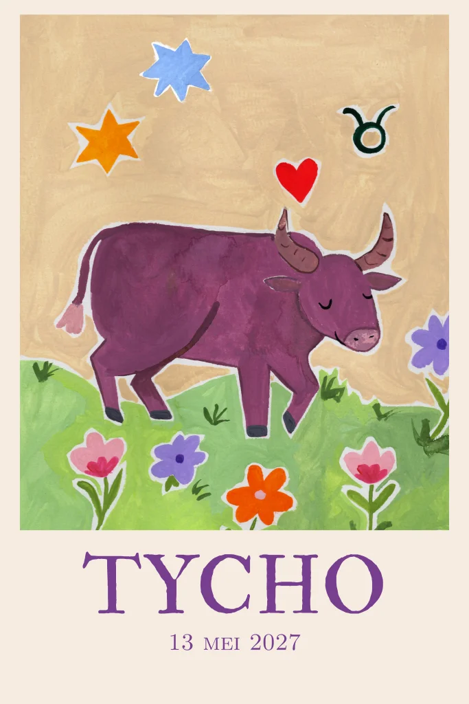 Een mooi geboortekaartje met een illustratie van het sterrenbeeld Stier. Op de voorkant staat een paarse stier in een landschap met bloemen en symbolen. Het kaartje heeft een rustige opbouw met de naam en geboortedatum onder de illustratie.
