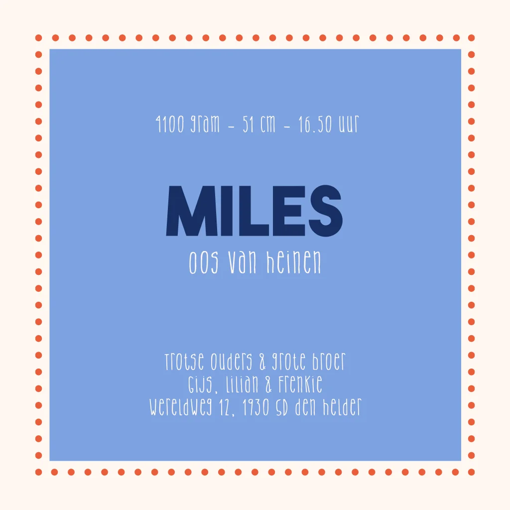 Het geboortekaartje is vormgegeven in blauw, geel en oranje. De naam is gedrukt in holografisch folie, wat een glanzend effect geeft op de voorkant. De gekleurde rand en stippen zorgen voor een herkenbaar geheel.