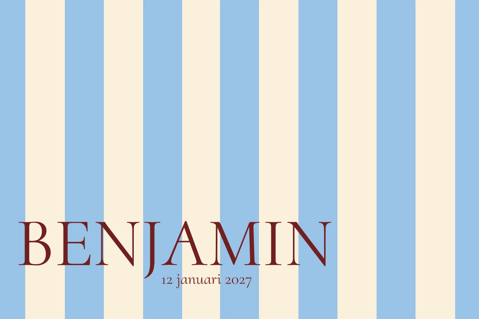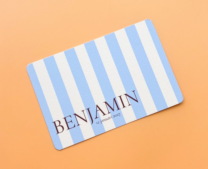 Kleurrijk vrolijk geboortekaartje met streepjes in baby blauw en licht geel.