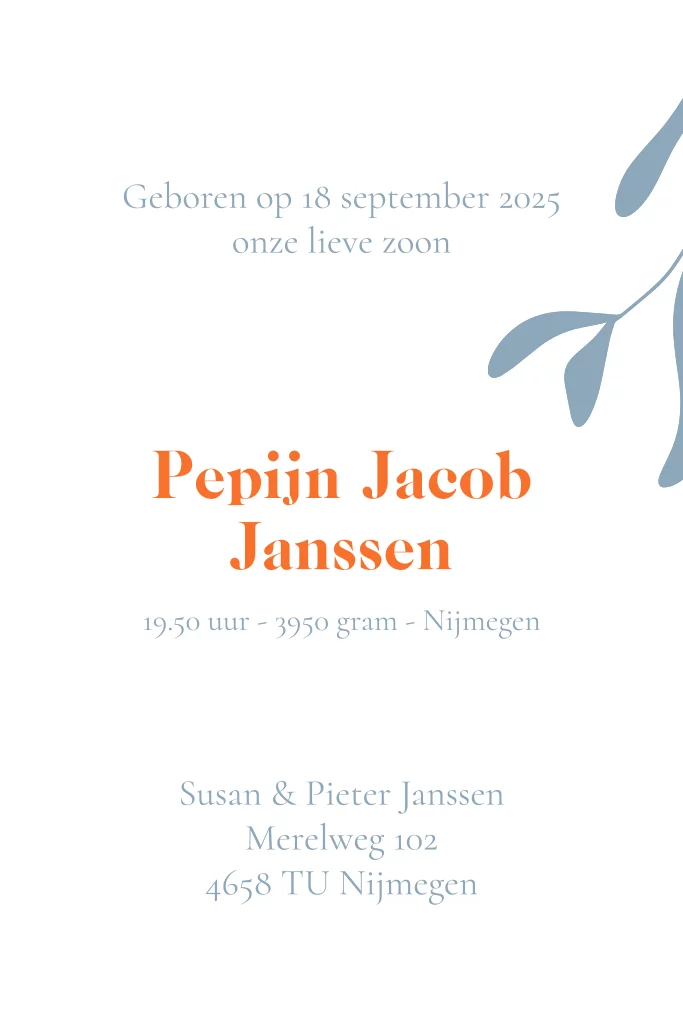 Mooi strak geboortekaartje met ijsblauwe takjes op de voorzijde en de naam van jouw kleintje in oranje. De naam is opgemaakt met een hoogglans laagje, om het nog specialer te maken.
