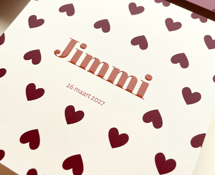 Een leuke print van burgundy hartjes én de naam in roestbruine hoogglans letters
