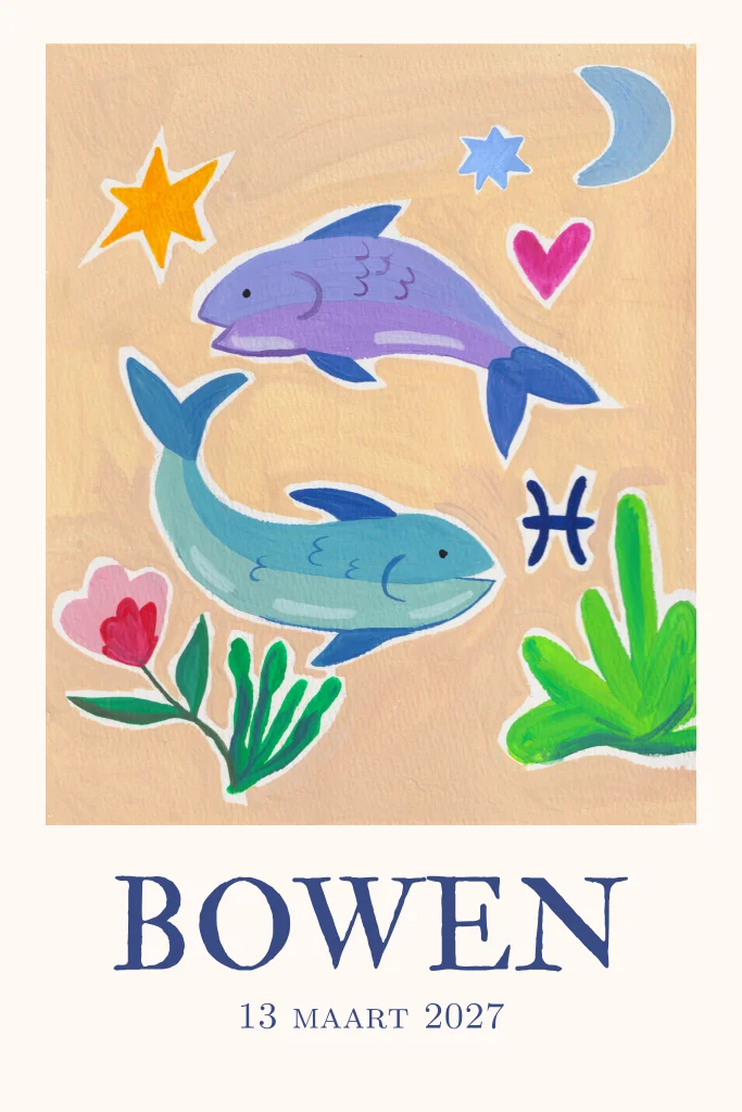Een mooi geboortekaartje met op de voorkant twee vissen en symbolen die verwijzen naar het sterrenbeeld Vissen. Dit kaartje past goed bij een geboorte voor een jongen met dit sterrenbeeld.
