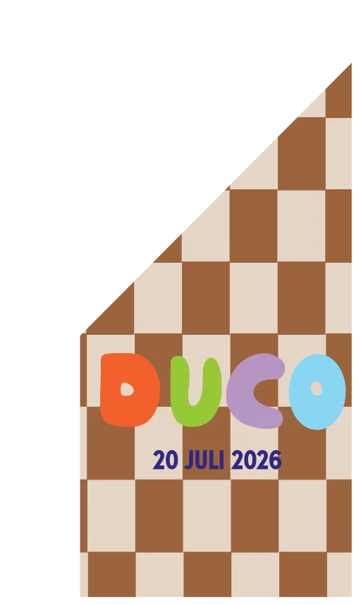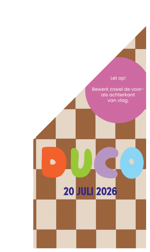 Stoere geboortevlag met blokjes in bruin en beige en gekleurde letters. Laat de hele buurt zien dat je kleine geboren is!