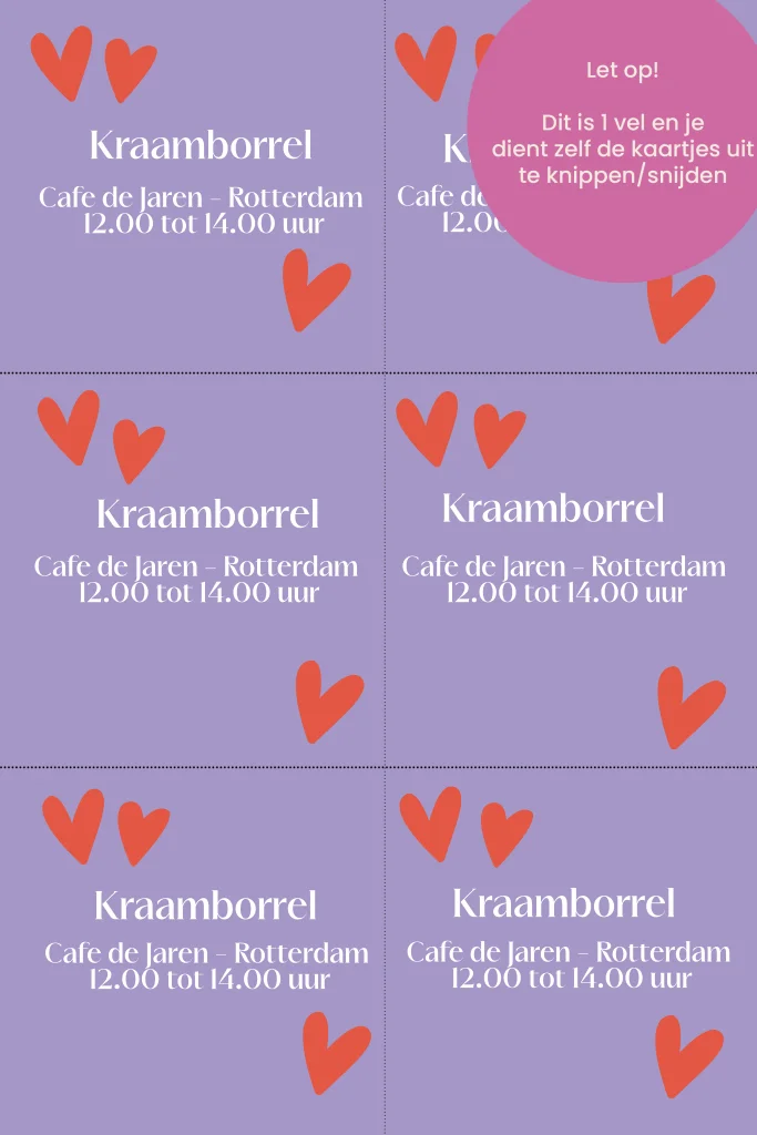 Kraamborrelkaartjes 6stuks lila met rode hartjes