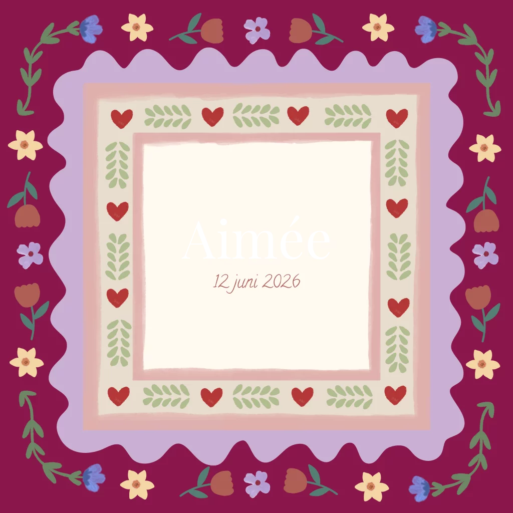 Een prachtig uniek kaartje met verschillende bloemetjes op de randen van het kaartje. Het geeft een vrolijk en schattig effect. De verschillende kleuren op het kaartje zijn aan te passen naar wens.