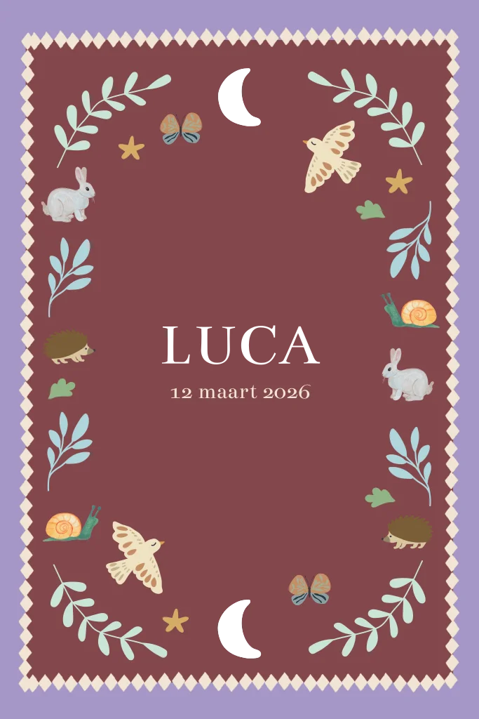 Geboortekaartje bosdiertjes paars bordeaux rood
