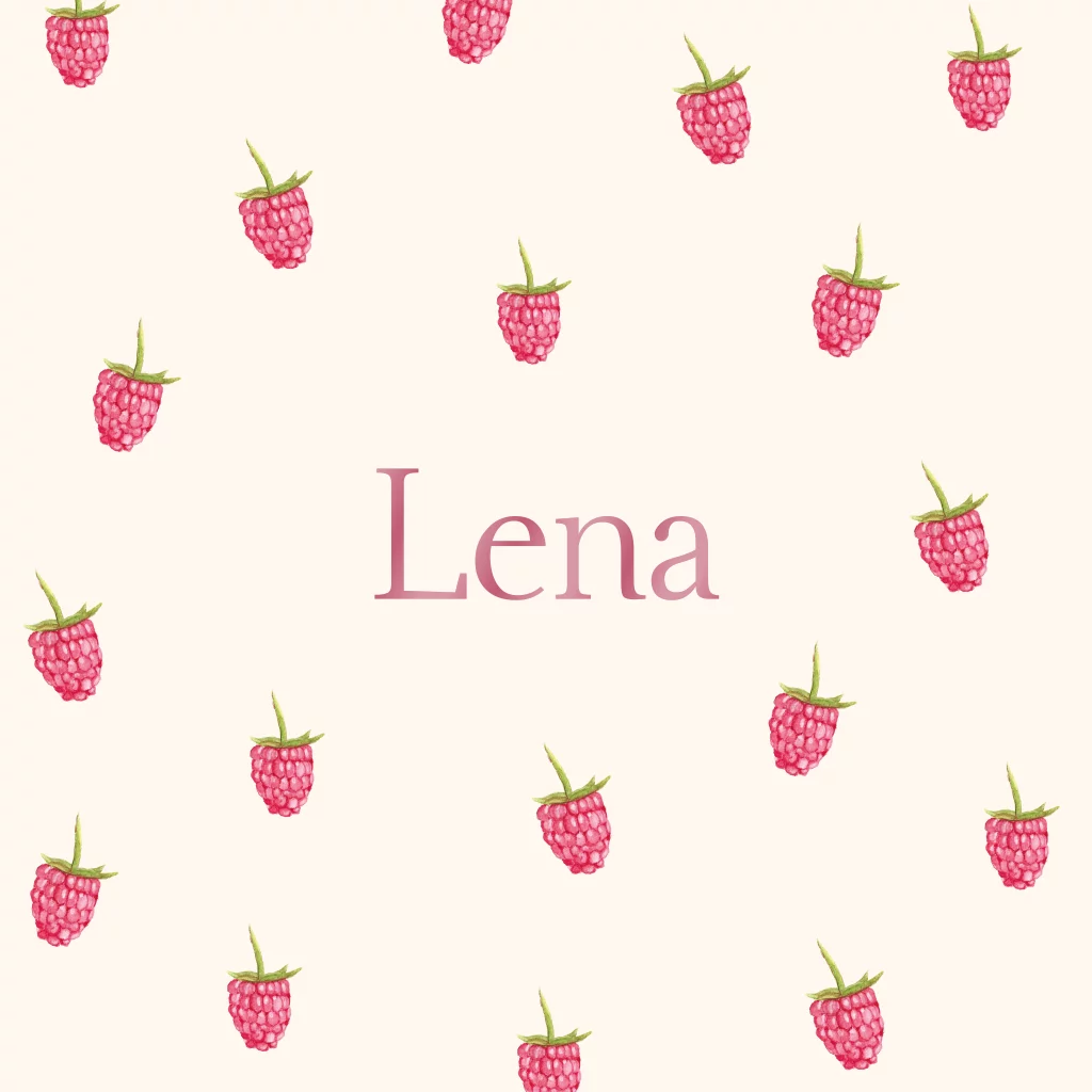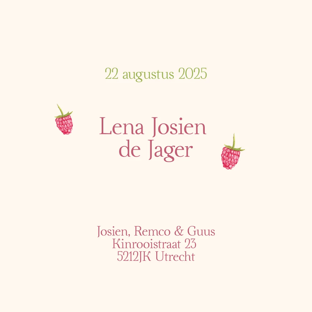 Schattig geboortekaartje met print van frambozen op een beige achtergrond.