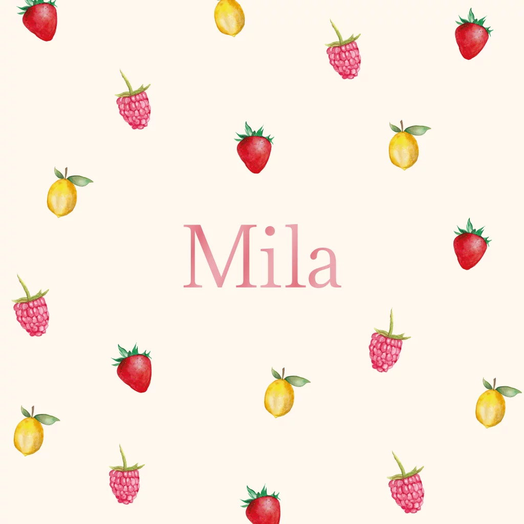 Vrolijk zomers geboortekaartje met verschillende soorten fruit.
