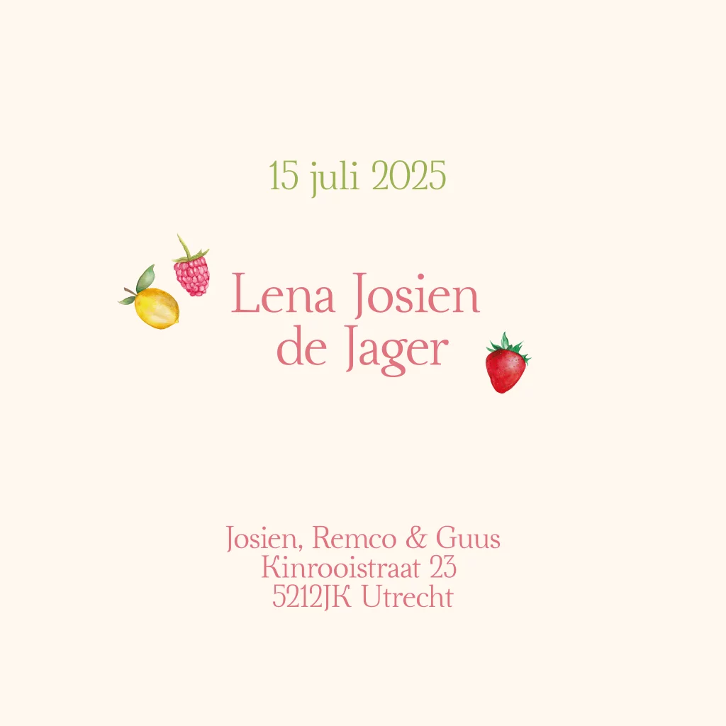 Geboortekaartje fruit rood, geel & roze dubbel vierkant