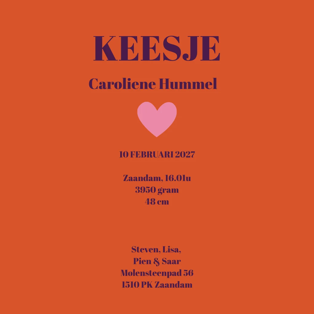 De kleuren rood, roze, geel en beige geven een retro uitstraling. Pas de kleuren, iconen en teksten eenvoudig aan zodat het geboortekaartje goed aansluit bij jullie wensen.