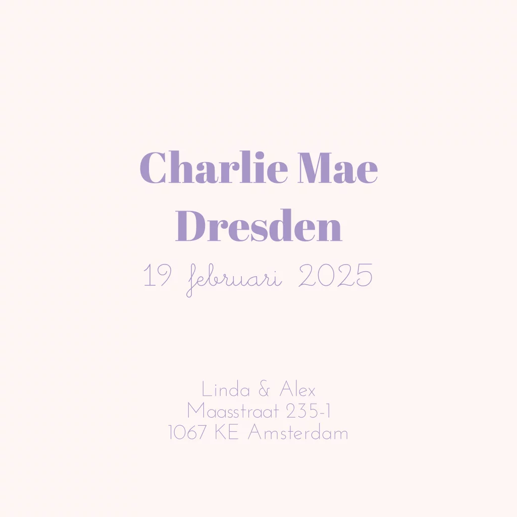 Uniek vierkant geboortekaartje met afgeronde hoeken.