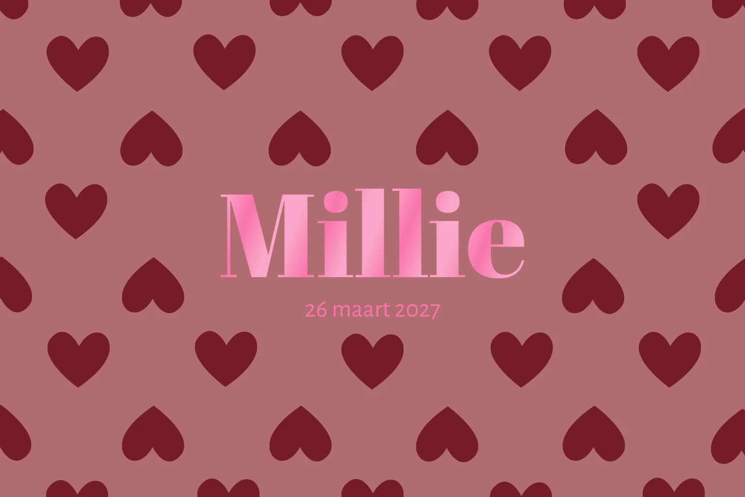 Ben je op zoek naar een uniek geboortekaartje in een echte trendkleur? Dan is dit geboortekaartje met burdungy hartjes echt iets voor jou! Door de letters in knalroze hoogglans springt de naam er mooi uit. Dit folie kun je ook aanpassen naar andere kleuren.