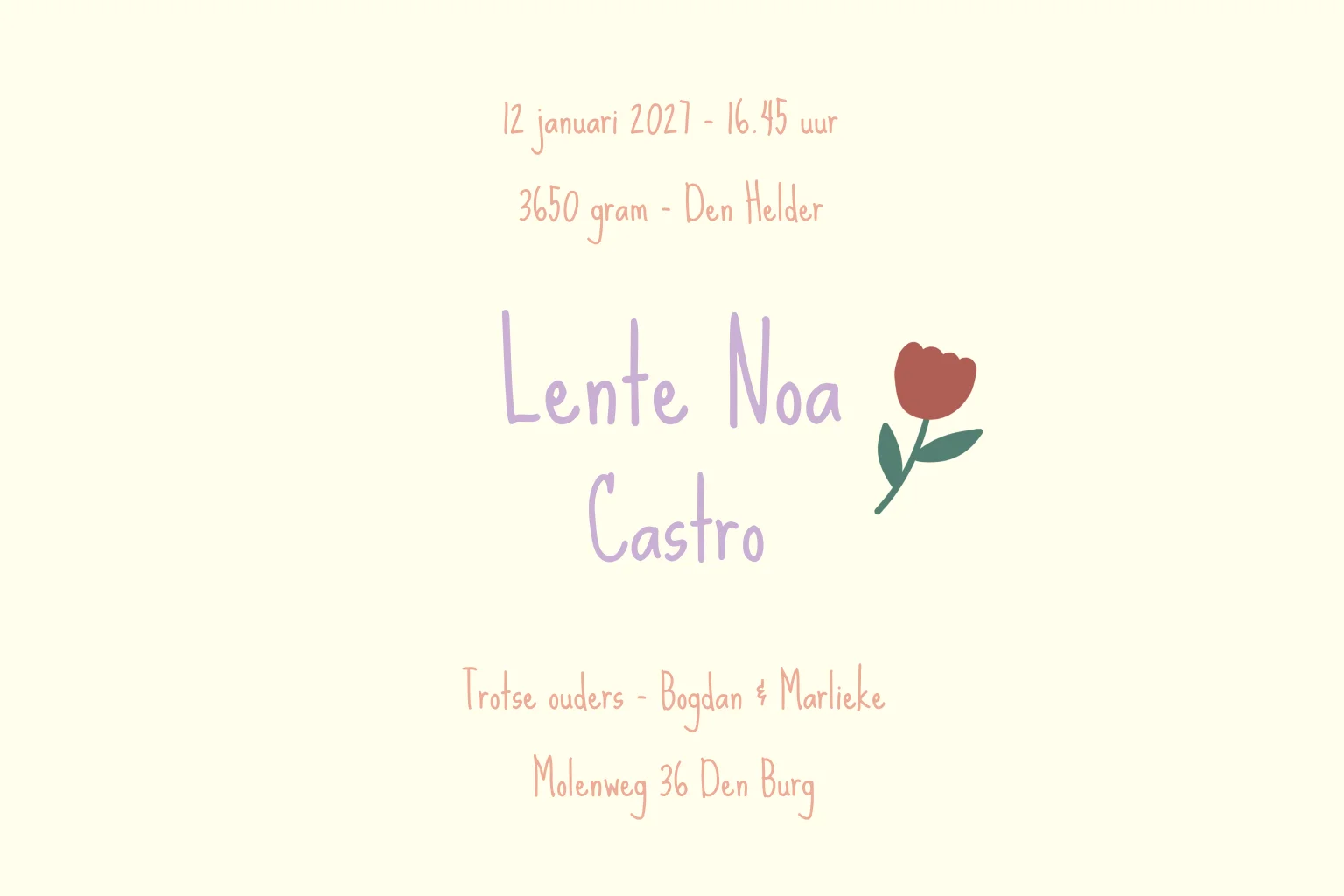 Alle teksten en gegevens zijn eenvoudig aan te passen in de editor. Dit geboortekaartje kan volledig worden gepersonaliseerd, zodat het kaartje aansluit bij jullie wensen.