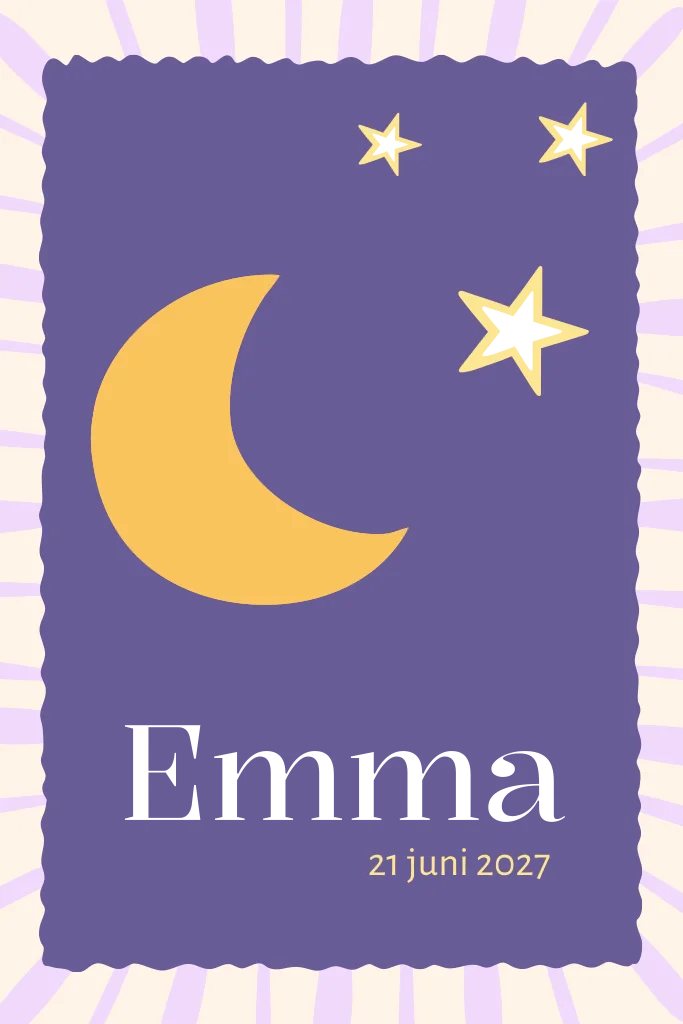 Een mooi geboortekaartje voor een meisje met een paarse achtergrond en een grote maan als centraal element.