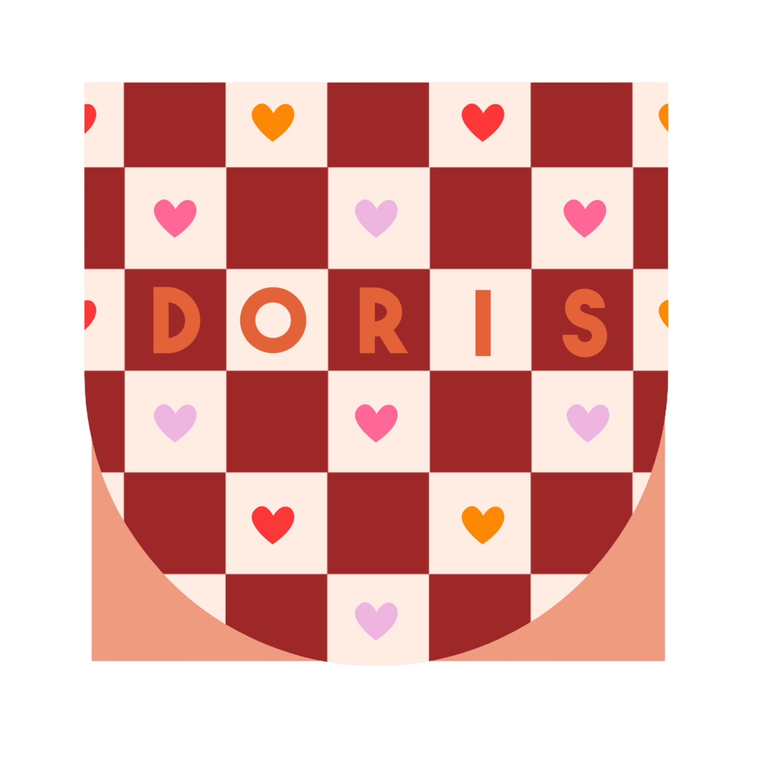 Dit geboortekaartje heeft een bordeauxrood checkerboard patroon met gekleurde hartjes in roze, lila, rood en oranje. /p>