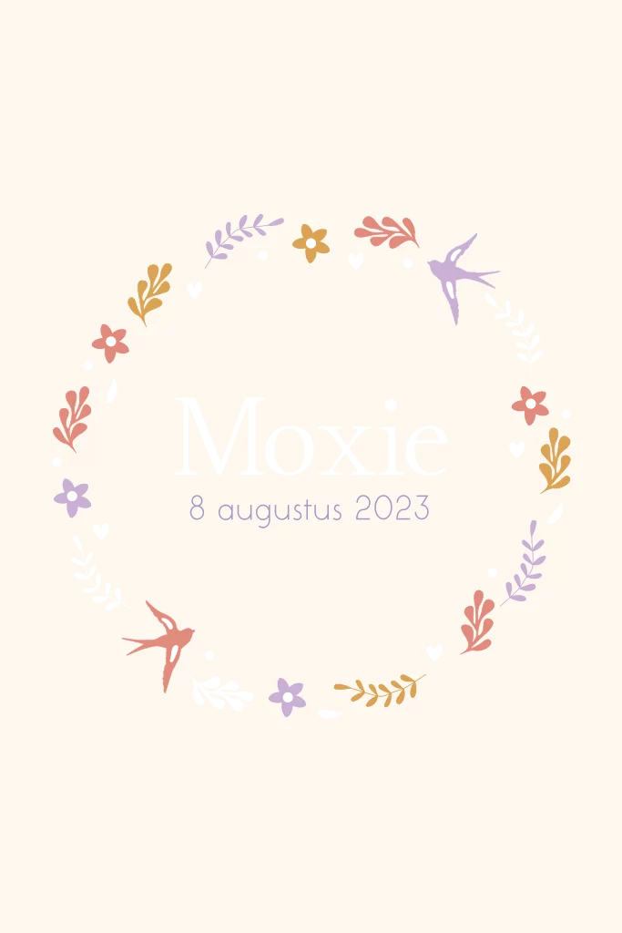 Lief geboortekaartje met op de voorkant een rondje gemaakt van bloemen, zwaluwen & elementen in goudfolie.