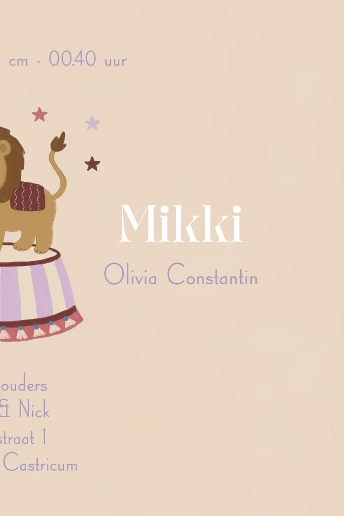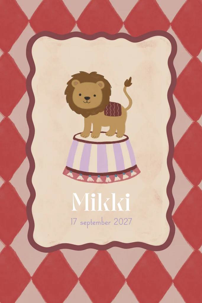 Een mooi geboortekaartje met een circus thema. Op het kaartje staat een leeuw op een podium binnen een kader met golvende rand.
