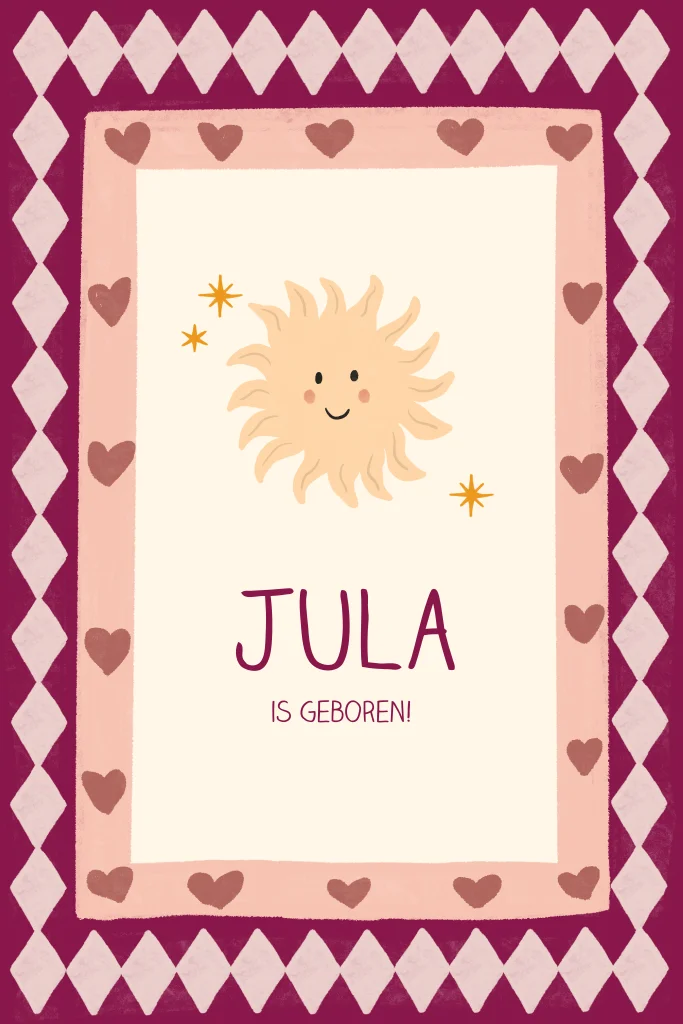 Dit geboortekaartje is uitgevoerd in rood, roze en zalm. De ruitjes en stipjes in de rand zorgen voor een herkenbaar patroon. Het zonnetje en de typografie sluiten aan bij het kleurenpalet en zijn in balans met de rest van het kaartje.