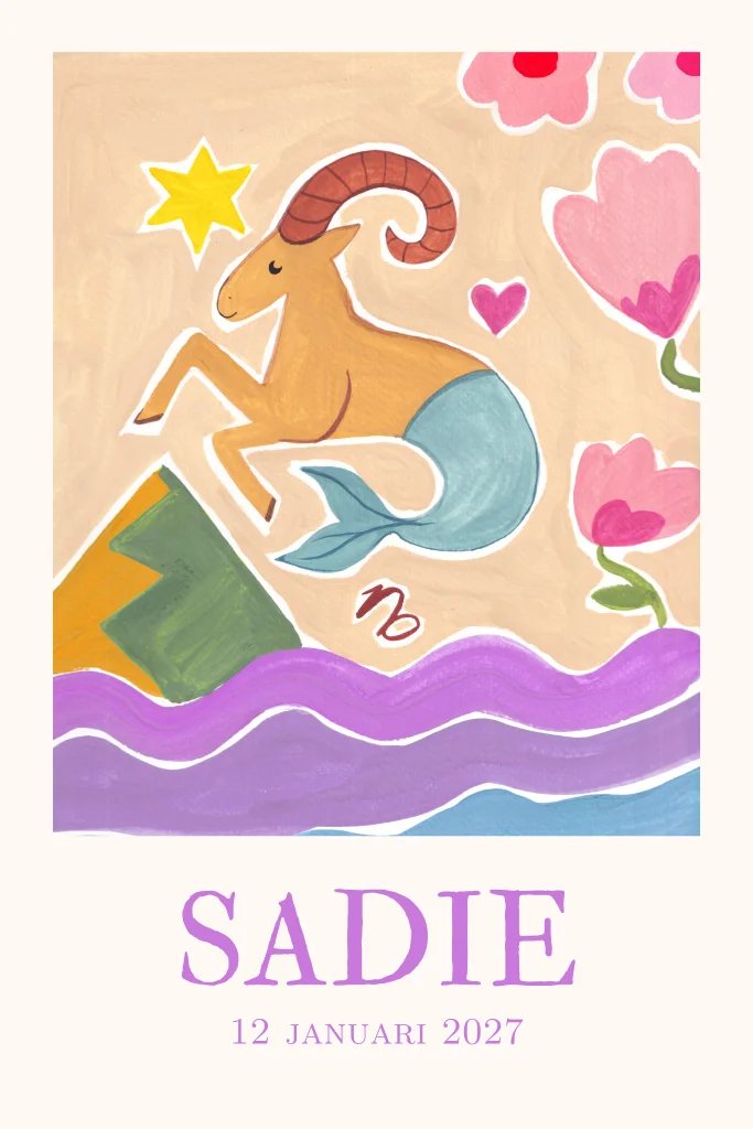 Een mooi geboortekaartje voor een meisje met een illustratie van het sterrenbeeld Steenbok. Het ontwerp toont een steenbok vissenstaart, sterren en bloemen. Dit kaartje past goed bij een geboorte in de winter.