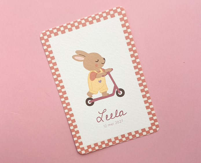 Een mooi geboortekaartje voor een meisje met een schattige illustratie van een konijntje op een step. Het diertje staat vrolijk in het midden en geeft het ontwerp een speelse uitstraling.