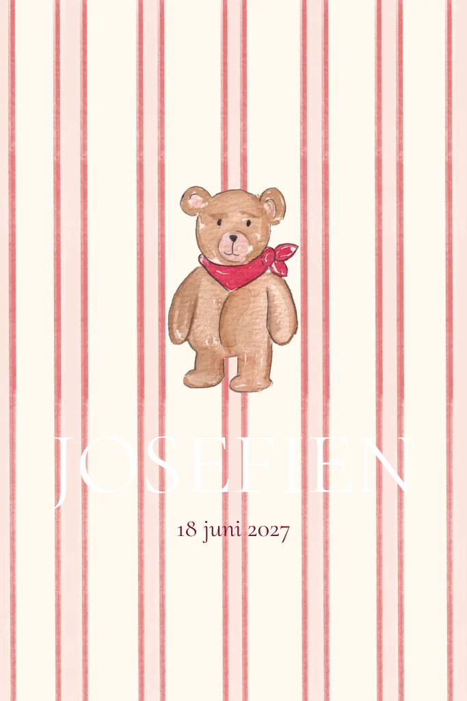 Een mooi geboortekaartje voor een meisje met verticale streepjes en een klassiek beertje op de voorkant. Het ontwerp heeft afgeronde hoeken en een rustige indeling waarin de illustratie centraal staat.
