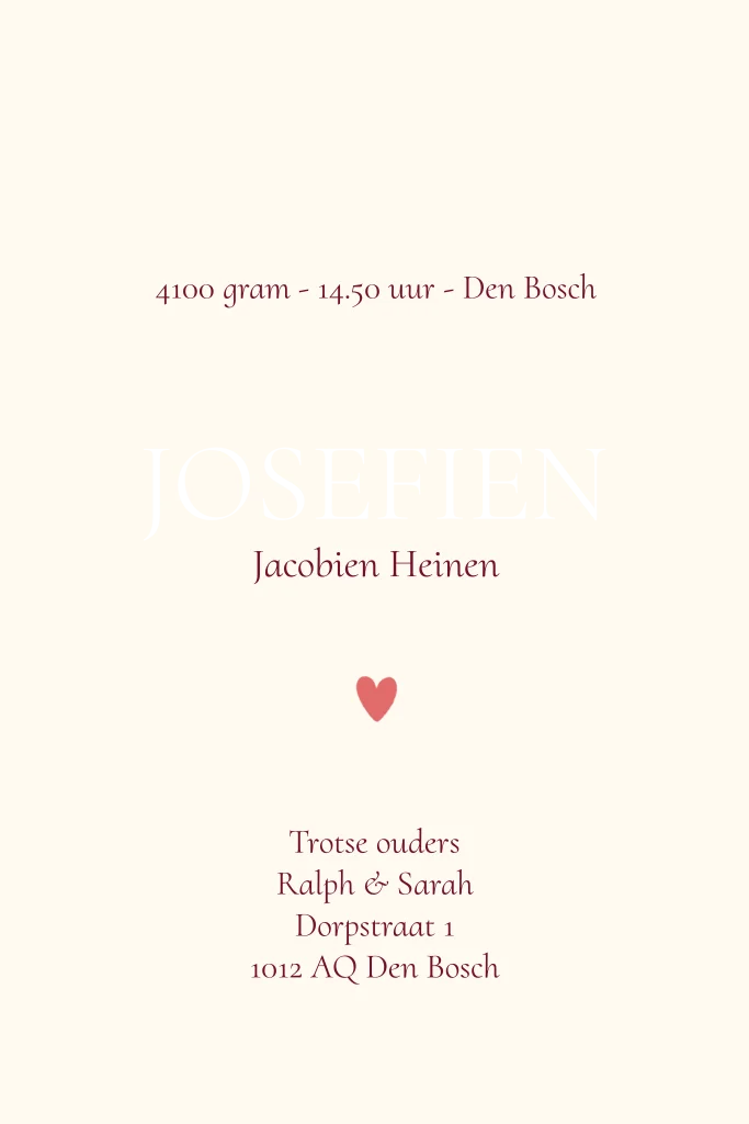 Alle tekst en kleuren zijn aanpasbaar in de editor, zodat je het geboortekaartje eenvoudig naar wens kunt aanpassen.