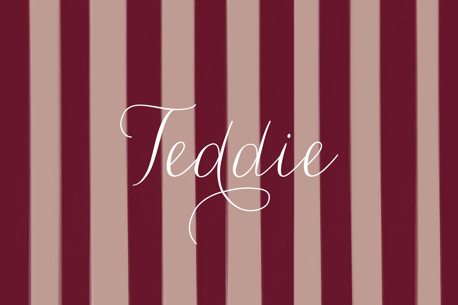 Geboortekaartje met oud roze & bordeaux rode strepen. De naam in geschreven lettertype in holografisch folie maakt het kaartje nog specialer.