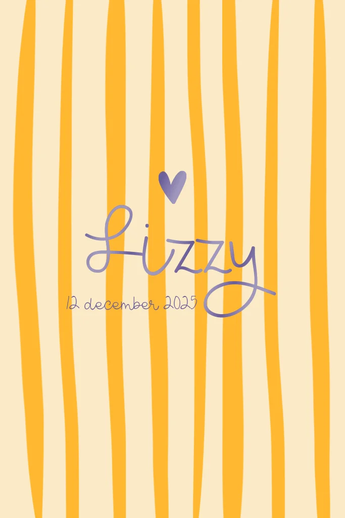 Kleurrijk geboortekaartje met streepjes in gele kleuren. De paarse tekst maakt de colorblocking compleet. Uiteraard zijn alle kleuren aan te passen naar wens..