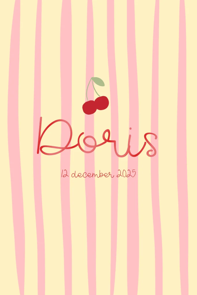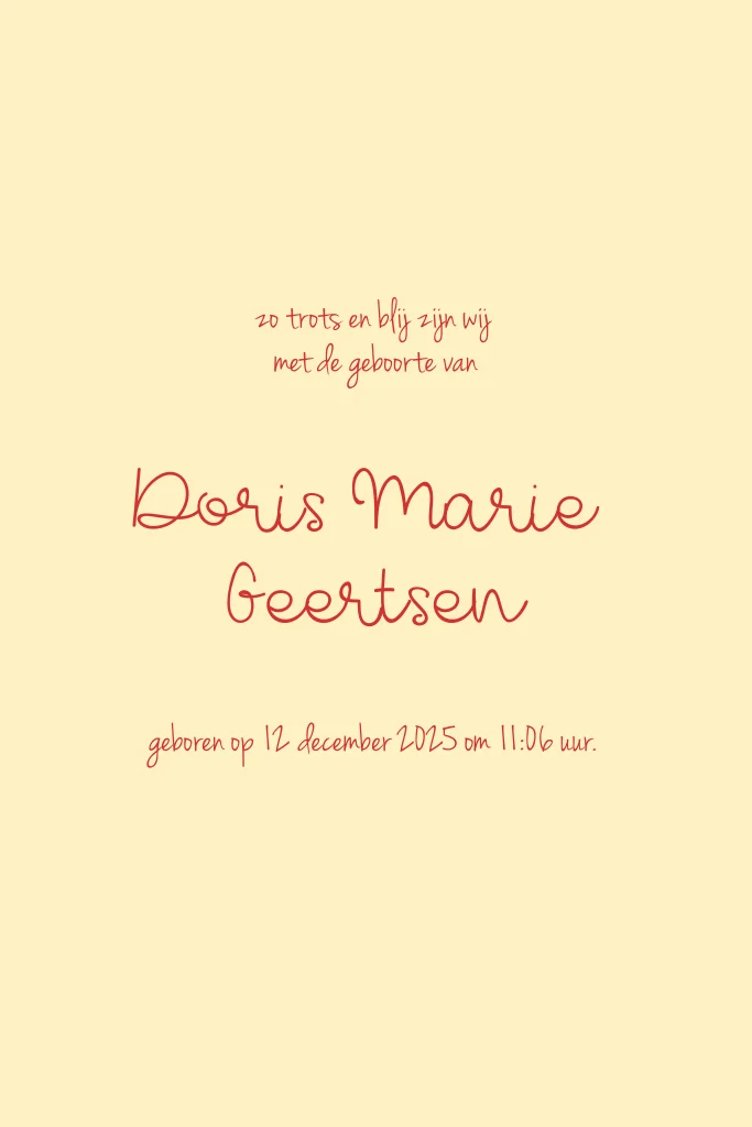Kleurrijk geboortekaartje met roze streepjes op een gele achtergrond. De rode tekst en de kerst maken de colorblocking compleet. Uiteraard zijn alle kleuren aan te passen naar wens in de handige editor.