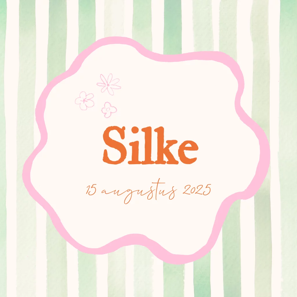 Schattig geboortekaartje voor een meisje met groene strepen en een roze kringelvorm.