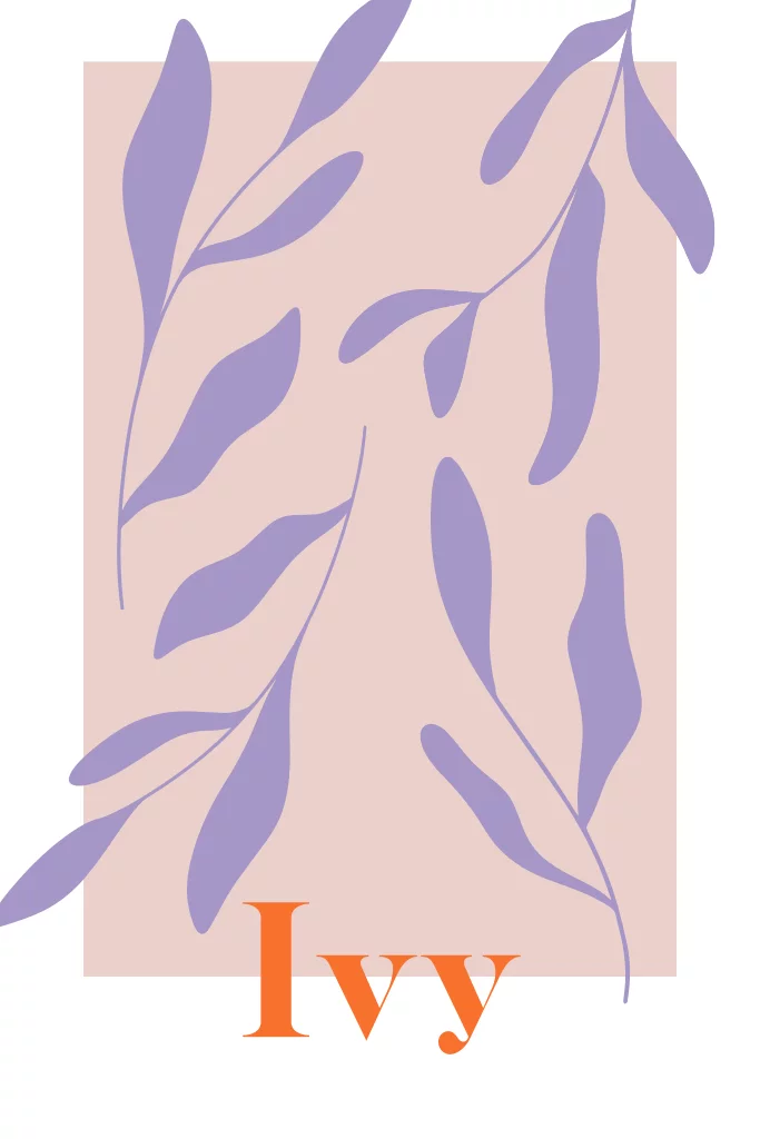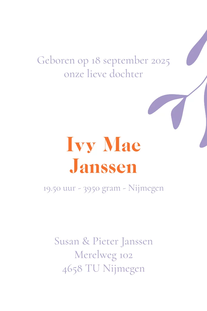 Mooi geboortekaartje met paarse takjes op een roze achtergrond.