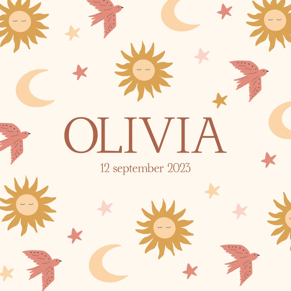 Lief geboortekaartje voor een meisje met een zonnetje, maantje, sterretjes en een zwaluw in mooie warme kleuren.