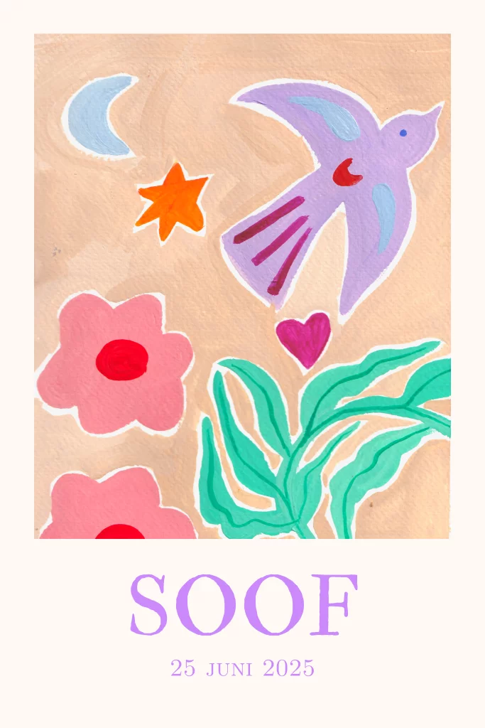De illustratie op het geboortekaartje met een zwaluw en bloemen is door ons geschilderd in gouache. Echt een uniek design dus.