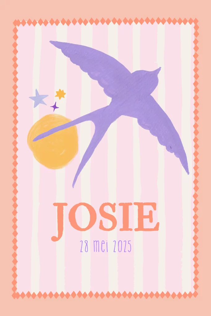 Uniek kleurrijk geboortekaartje met strepen, een zwaluw en een zon.