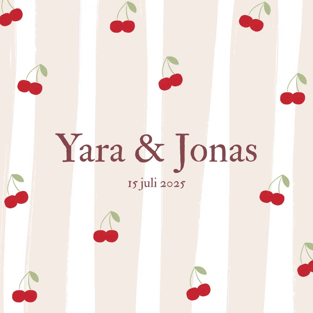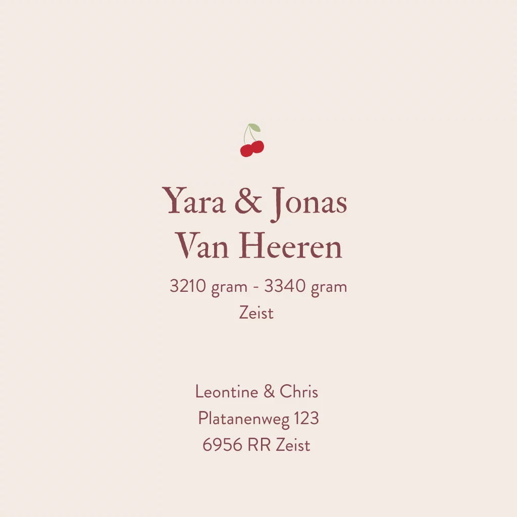 Lief geboortekaartje met patroon streepjes en kersjes. Leuk voor een tweeling die geboren wordt in de zomer! Het kaartje heeft een uniseks uitstraling door de beige kleuren.