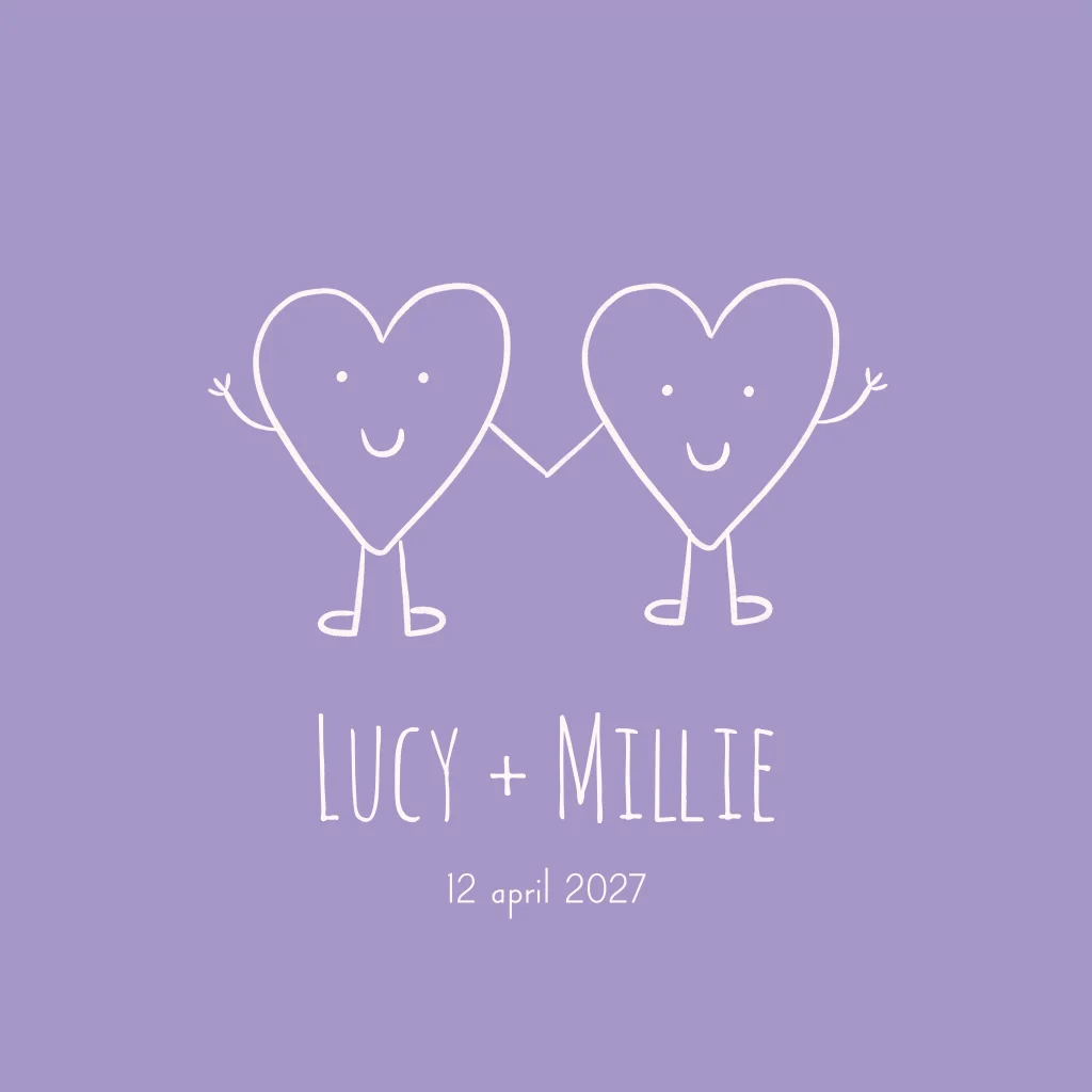 Een mooi geboortekaartje voor een meisje met getekende hartjes op de voorzijde. Dit geboortekaartje is ontworpen voor een tweeling en laat beide meisjes samen zien in één beeld.