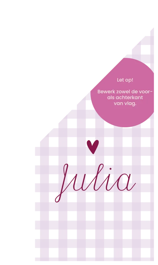 Prachtige geboortevlag met blokjes vichypatroon in lila en wit. Maak de aankondiging van de geboorte van je kindje extra bijzonder met deze unieke geboortevlag. De combinatie van lila en wit zorgt voor een moderne uitstraling, terwijl het geometrische patroon een eigentijdse touch toevoegt. De vlag is perfect voor ouders die op zoek zijn naar een originele manier om de geboorte van hun kindje te vieren. De geboortevlag is gemaakt van hoogwaardig materiaal en is geschikt voor zowel binnen als buiten gebruik. Hang de vlag aan de gevel van je huis of in de tuin om iedereen te laten weten dat jullie kindje is geboren. De opvallende kleuren en het stijlvolle ontwerp maken deze vlag een echte eyecatcher.