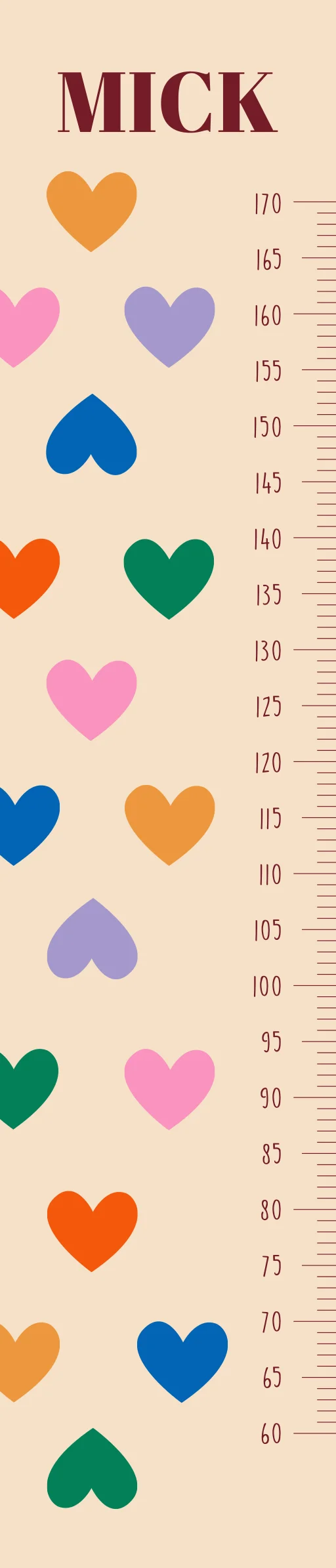Een leuke groeimeter voor op de kinderkamer! Deze groeimeter is niet alleen handig maar maakt de kamer ook vrolijk door de vrolijke kleuren van de hartjes. Uiteraard kan dit in stijl van het geboortekaartje, of je gaat voor een leuk printje die je op de kinderkamer vindt passen.