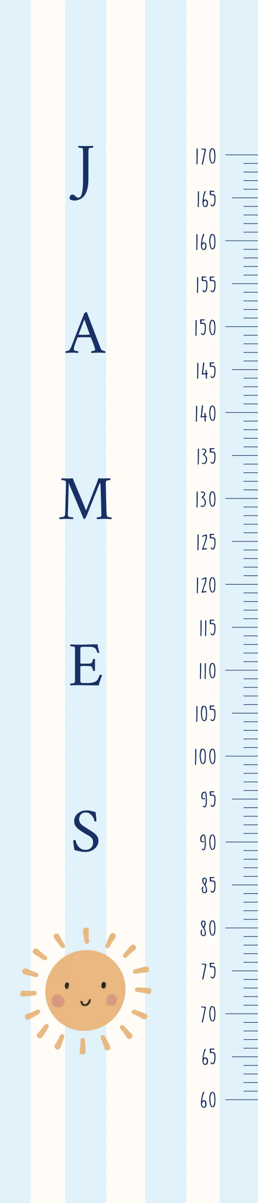 Een leuke groeimeter voor op de kinderkamer! Deze groeimeter is niet alleen handig maar maakt de kamer ook vrolijk door de streepjes en zonnetje. Uiteraard kan dit in stijl van het geboortekaartje, of je gaat voor een leuk printje die je op de kinderkamer vindt passen.