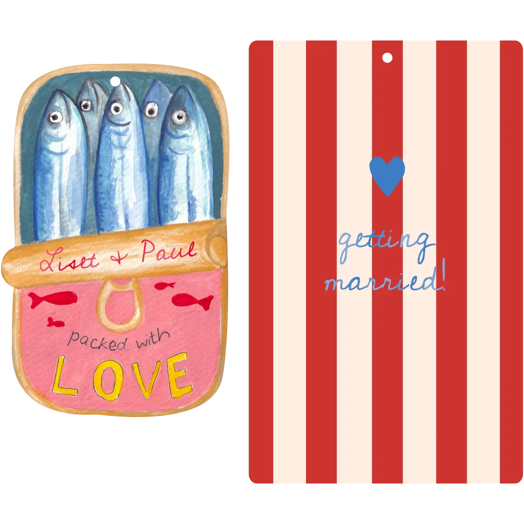 Mooie unieke stapel trouwkaart sardientjes in een blik en streepjeskaart. Leuk voor als je op het strand trouwt, of een bruiloft viert in de mediterraanse zon!